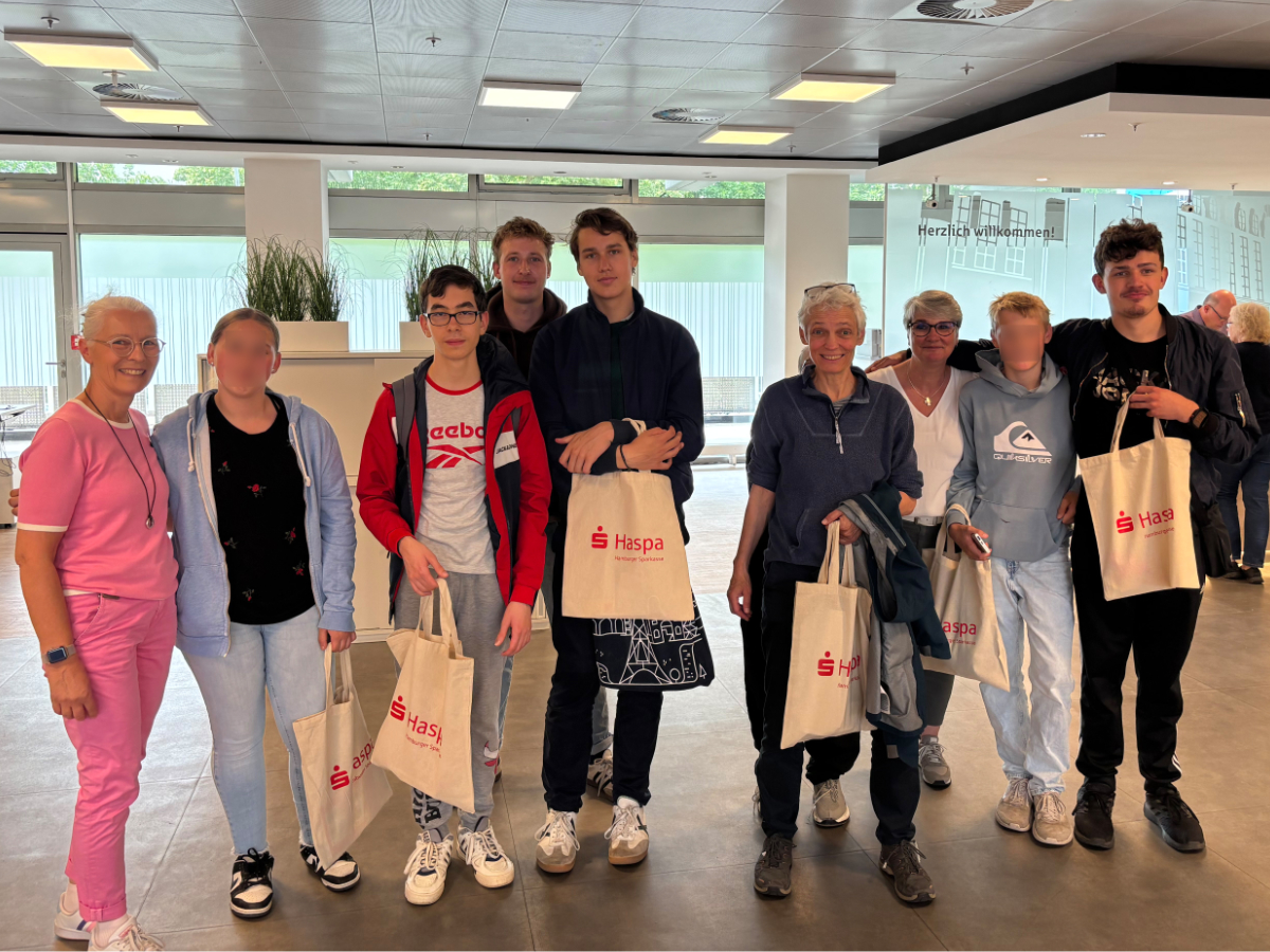Am Dienstag, den 24.6.2025, war der Kurs „Rechnen im Alltag“ zu Besuch bei der HASPA in der Hamburger Meile. Die beiden ausgesprochen netten und zugewandten Sparkassen-Mitarbeiterinnen Katja Becker und Dorothee Weichgrebe zeigten uns die vielen Einsatzbereiche und Tätigkeiten, die dort möglich sind. Sie haben uns erklärt, wie die Geldzählmaschine und der Geldautomat funktioniert. Außerdem durften wir den Tresorraum betreten und die dicke schwere Tür zu diesem Raum bewundern. Weitere Mitarbeiter haben uns genau erklärt, was sie dort in der HASPA machen, z.B. Kunden beraten, wie man Geld anlegt. Wir finden, das war eine tolle Führung durch die Sparkasse!