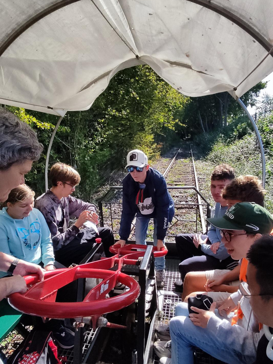 Am nächsten Tag stand ein besonderes Highlight auf dem Programm: die Draisinenfahrt. Nachdem wir am Startpunkt angekommen waren, warteten wir noch auf die anderen Gruppen. In der Zwischenzeit konnten wir Bogenschießen ausprobieren, was vielen richtig gut gefallen hat. Es gab dort auch einen kleinen Kiosk, an dem sich einige etwas zu trinken oder zu naschen kauften. Auf dem Rückweg haben wir gemeinsam gegrillt – ein schöner Abschluss des Ausflugs. Danach ging es mit dem Bus zurück zur Herberge.
